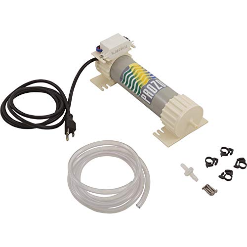 The PZ5 110 VAC compressor driven ozone generator is ideally designed to stand alone injecting ozone into all water applications up to 800 gallons such as spas jetted tubs aquariums cisterns and small ponds. The PZ5 series come complete with our patented Corona Hybrid Arc Tube inside a pressurized cartridge solid state ballast internal mini compressor and our exclusive Mycropore Diffuser installation kit. Prozone patented Corona Hybrid Arc Tube harnesses the high ozone concentrations of Corona Discharge generators while maintaining the simplicity and reliability of VUV technology. Prozone’s exclusive Mycropore Diffusers ensure optimal ozone absorption through the use of porous stainless steel diffusion disks. The housing and gaskets are constructed of superior ozone resistant materials for long life and easy cleaning without deterioration. Low cost low maintenance operation. Warranty System: 2 years Pump: 1 year. Compatible with all major spa brands. Easily retrofit table to existing spas. 110 VAC 60 Hz. Connection: 3 Prong Nema Plug. Ozone Purity: 100 Percent no nitrogen by products. Maximum Air Flow Rate: 8 CFH @ 0 PSI 3 CFH @ 2 PSI. Arc Life (nominal): 20 000 hours. Operating Temperature: +25° F to +120° F. Weight: 8 lbs. Dimensions: 15½”W x 3″D x 7 ½”H. More Reviews On Amazon